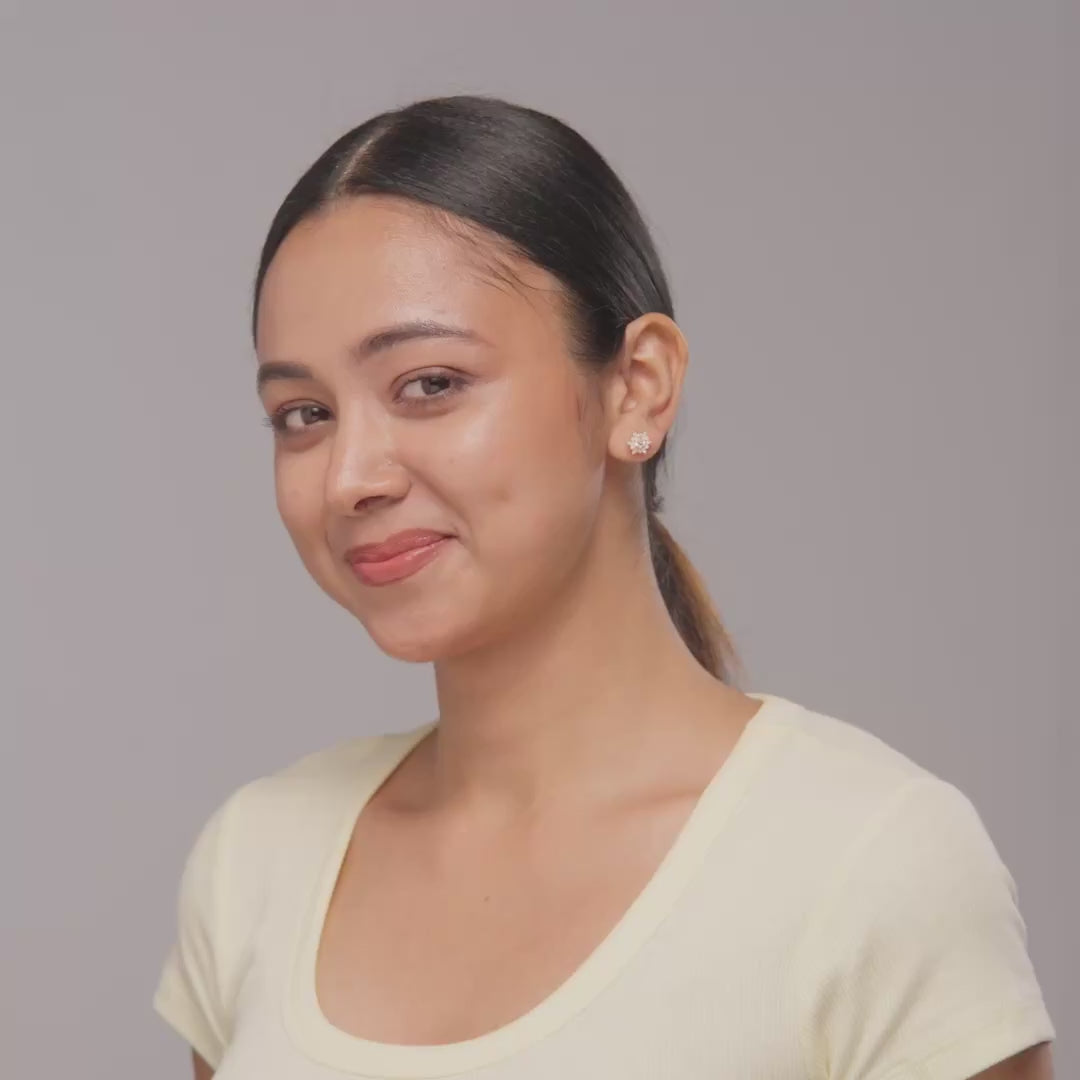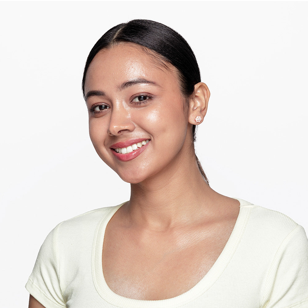 Aster Ray Studs capture delicate elegance crafted from 92.5 Sterling Silver and finished with a warm rose gold plating. Featuring radiant round clear CZ stones arranged in a starburst pattern, these studs sparkle with timeless charm. The high-polish mirror finish adds a refined touch, perfect for casual and work wear. Available also in a classic silver finish, these versatile studs effortlessly elevate any ensemble, offering a subtle yet sophisticated statement for everyday elegance.