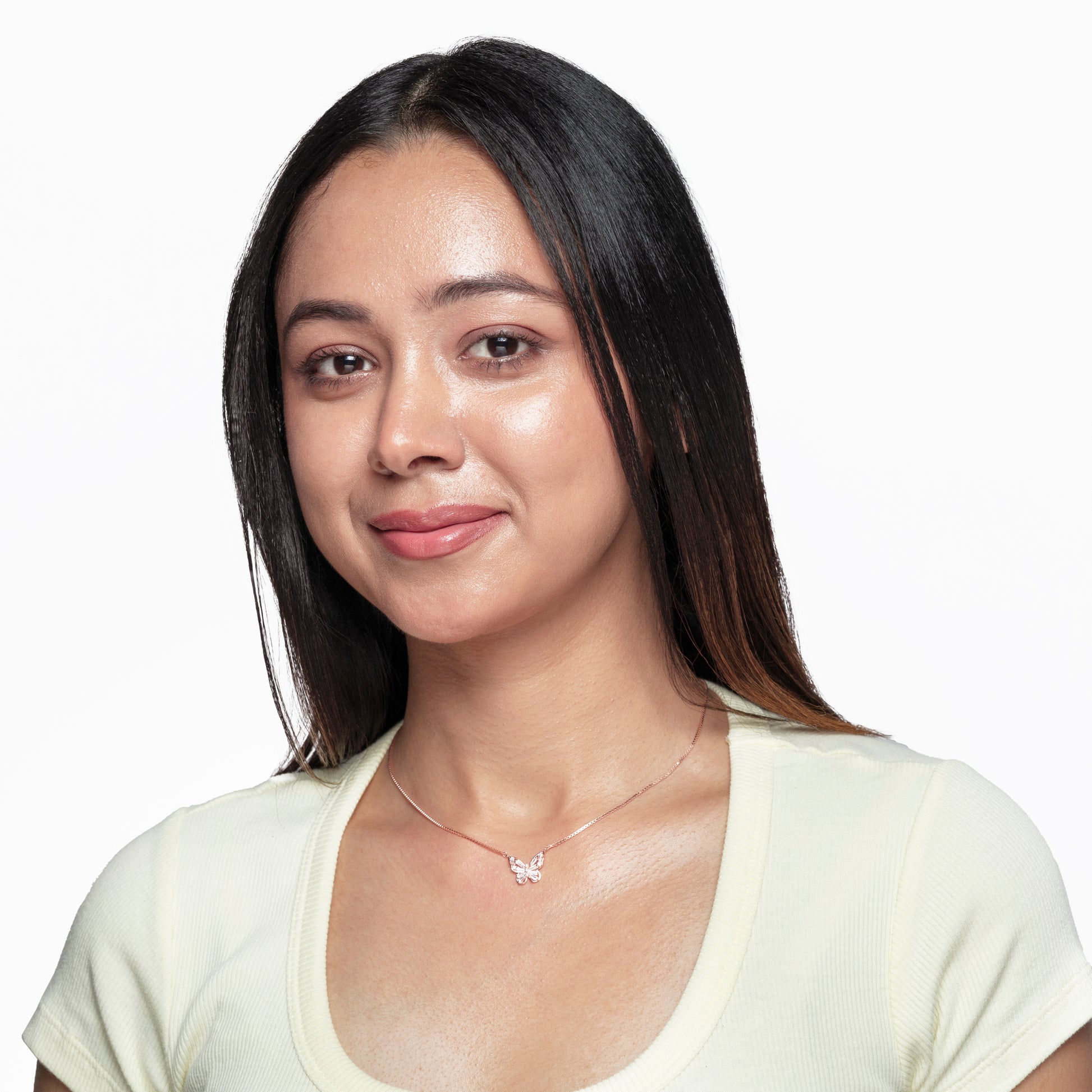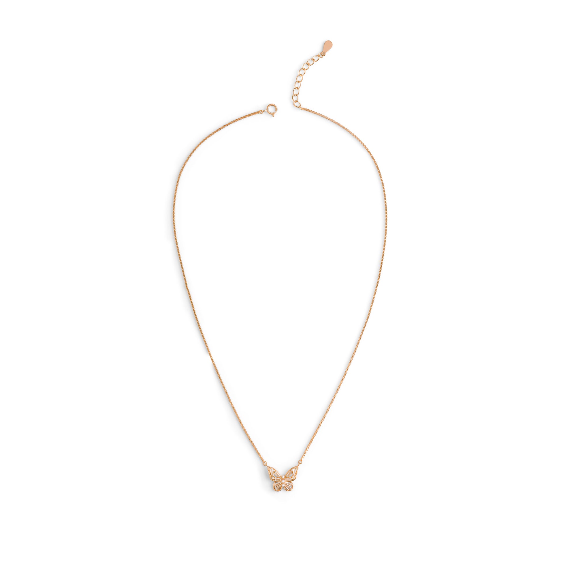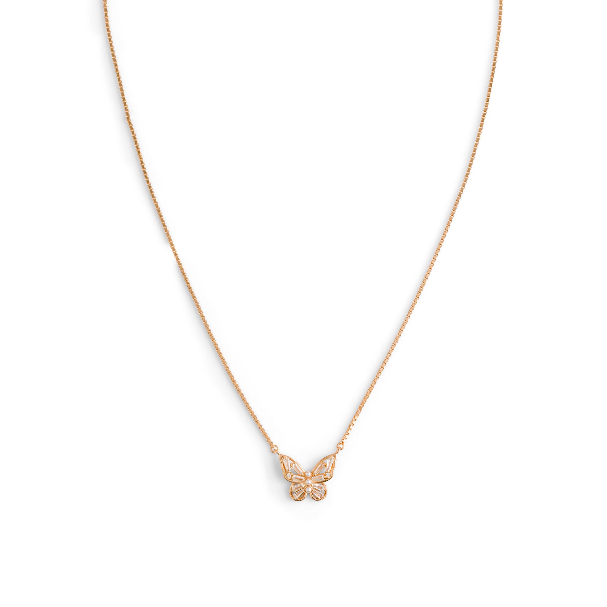 Delicate butterfly pendant crafted in sterling silver, detailed with baguette-cut clear CZ stones for a refined shimmer. A polished finish adds charm to casual and work outfits alike. Available in rose gold finish.