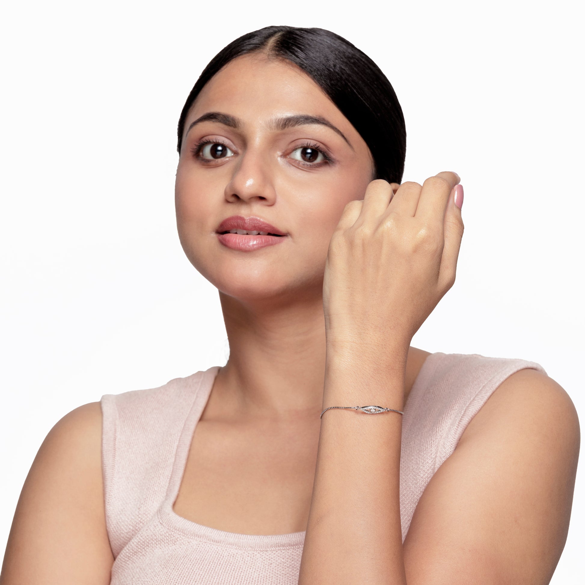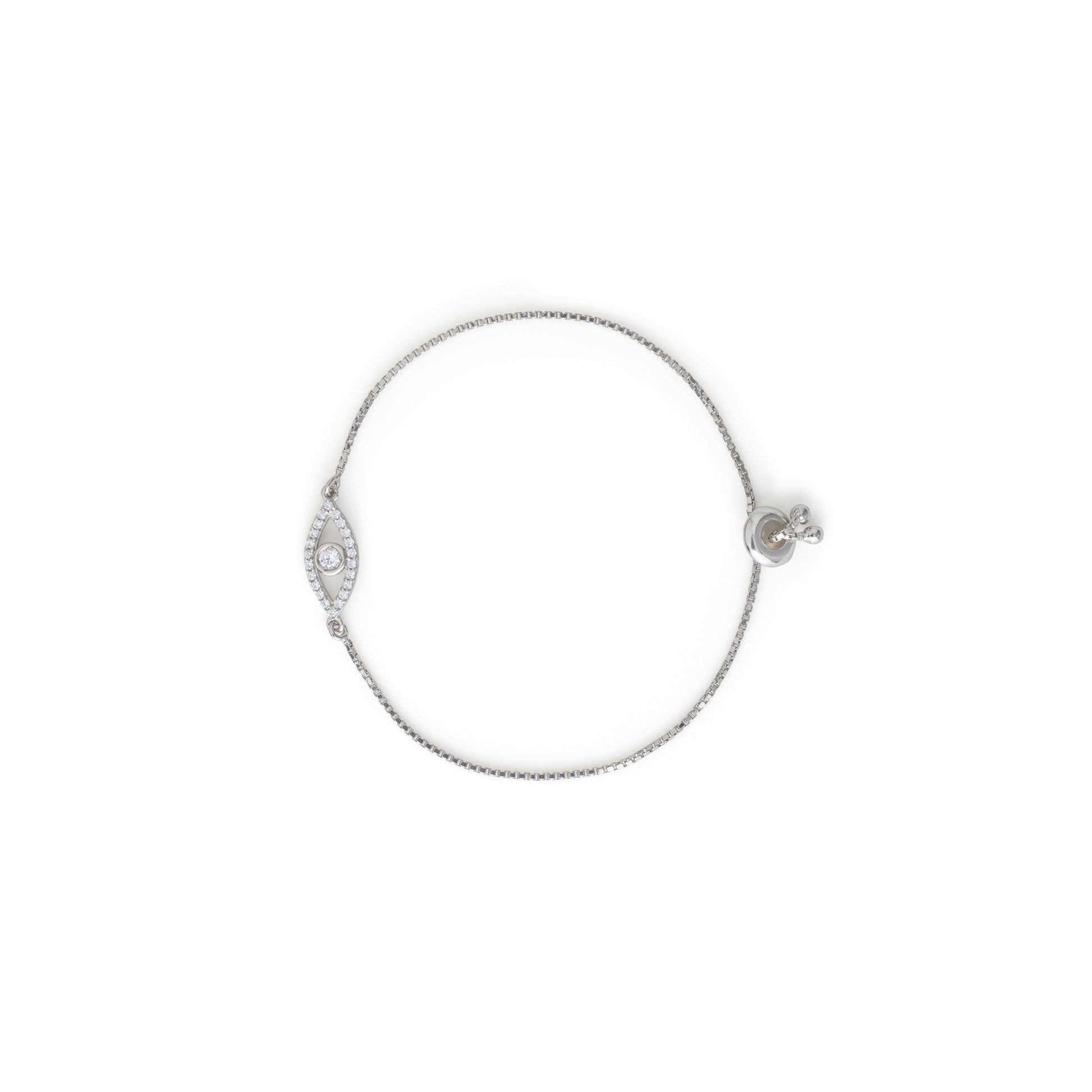 A delicate adjustable bracelet in sterling silver featuring a classic evil eye motif set with round clear CZs and a sleek mirror finish. Perfect for casual or work wear. Available in both silver and rose gold finishes.