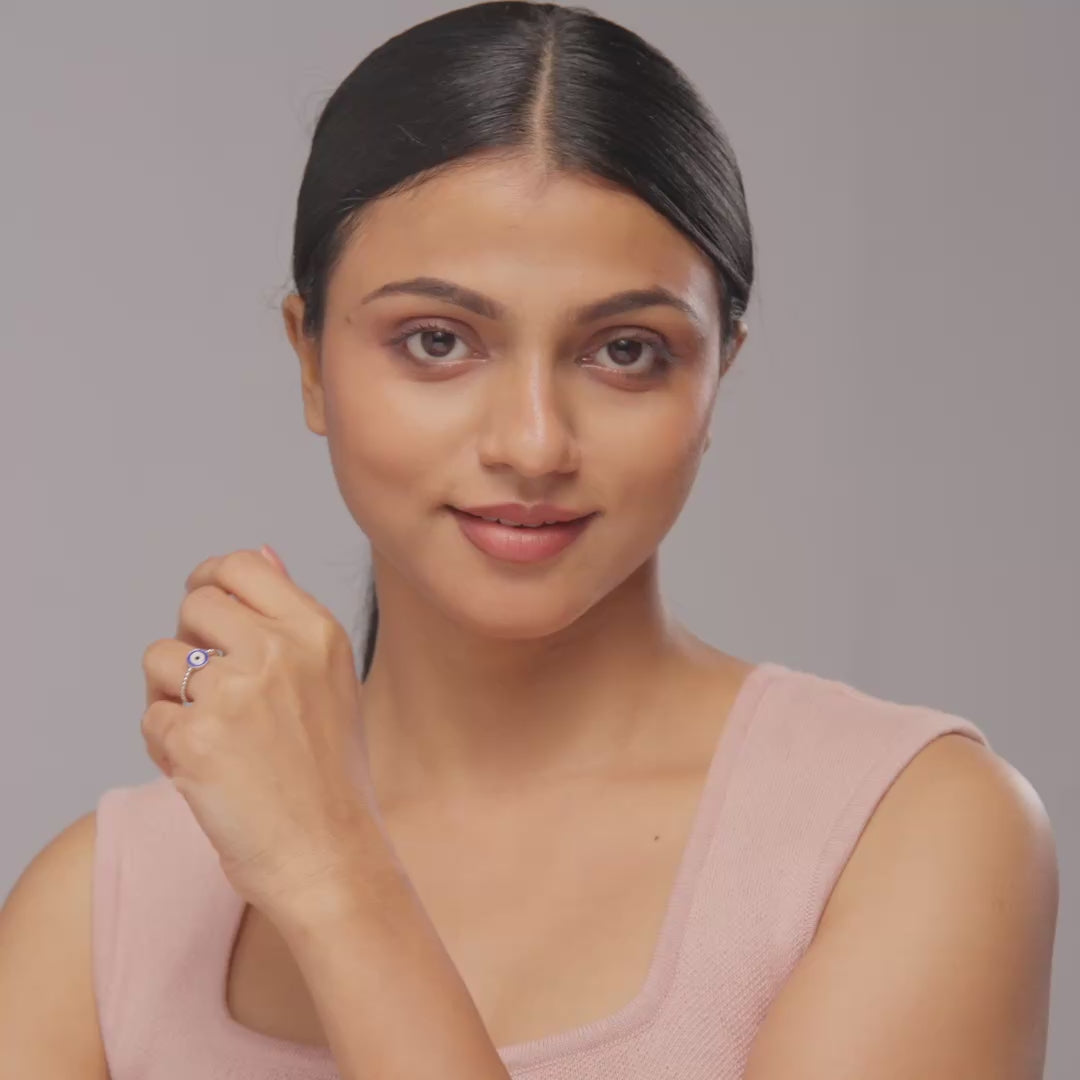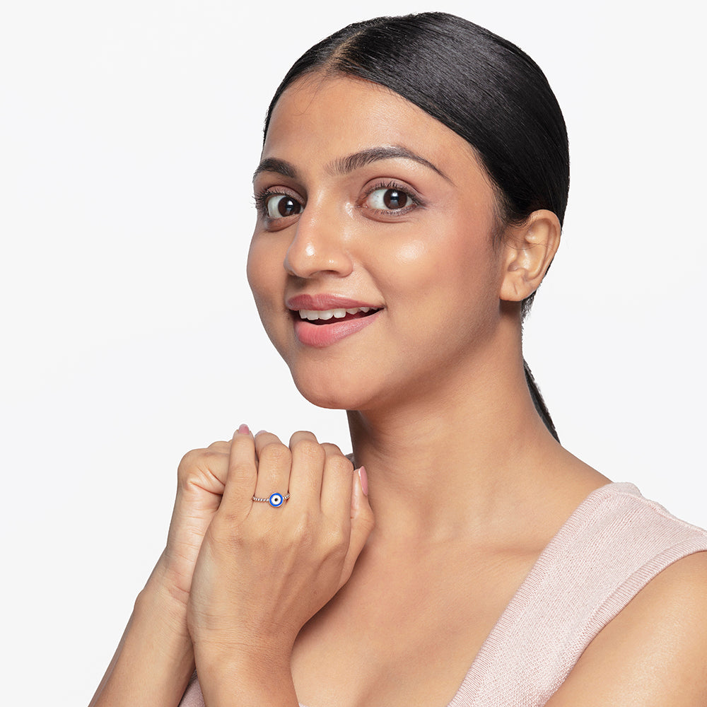 This 925 Sterling Silver, Classic Evil Eye Ring in silver finish showcases the iconic evil eye motif in vibrant enamel, set against a mirror finish for casual and work wear. For added choice, it is also available in a warm rose gold finish, combining protection symbolism with modern style.
