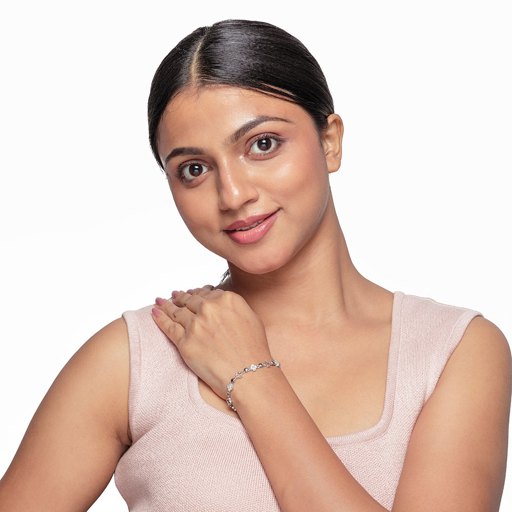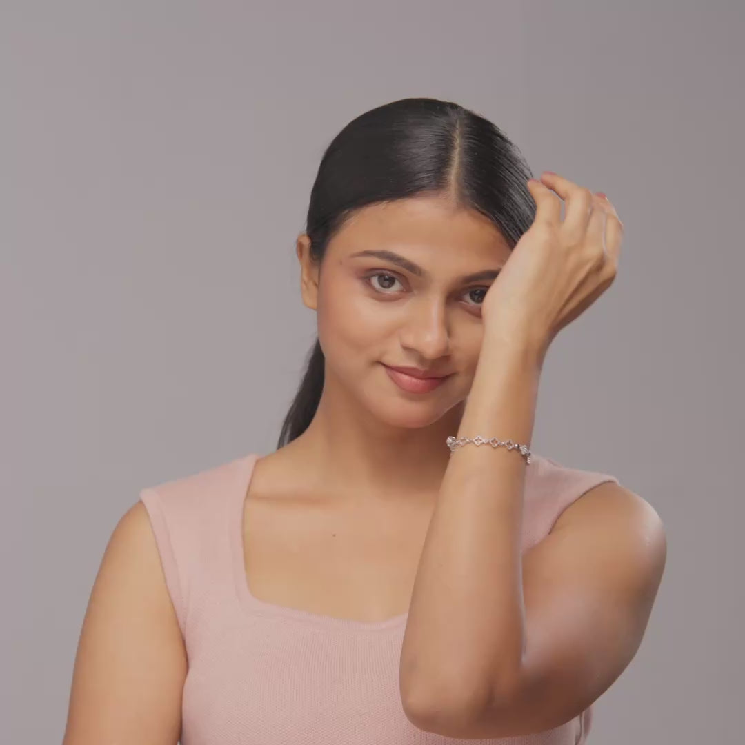 Clover Bracelet in silver finish on 925 Sterling Silver features charming clover motifs adorned with round clear cubic zirconia stones, all enhanced by a polished mirror finish. This versatile bracelet is perfect for casual, work, or occasion wear, offering a blend of elegance and subtle sparkle. Its durable 925 Sterling Silver construction ensures long-lasting beauty and comfort for daily use.