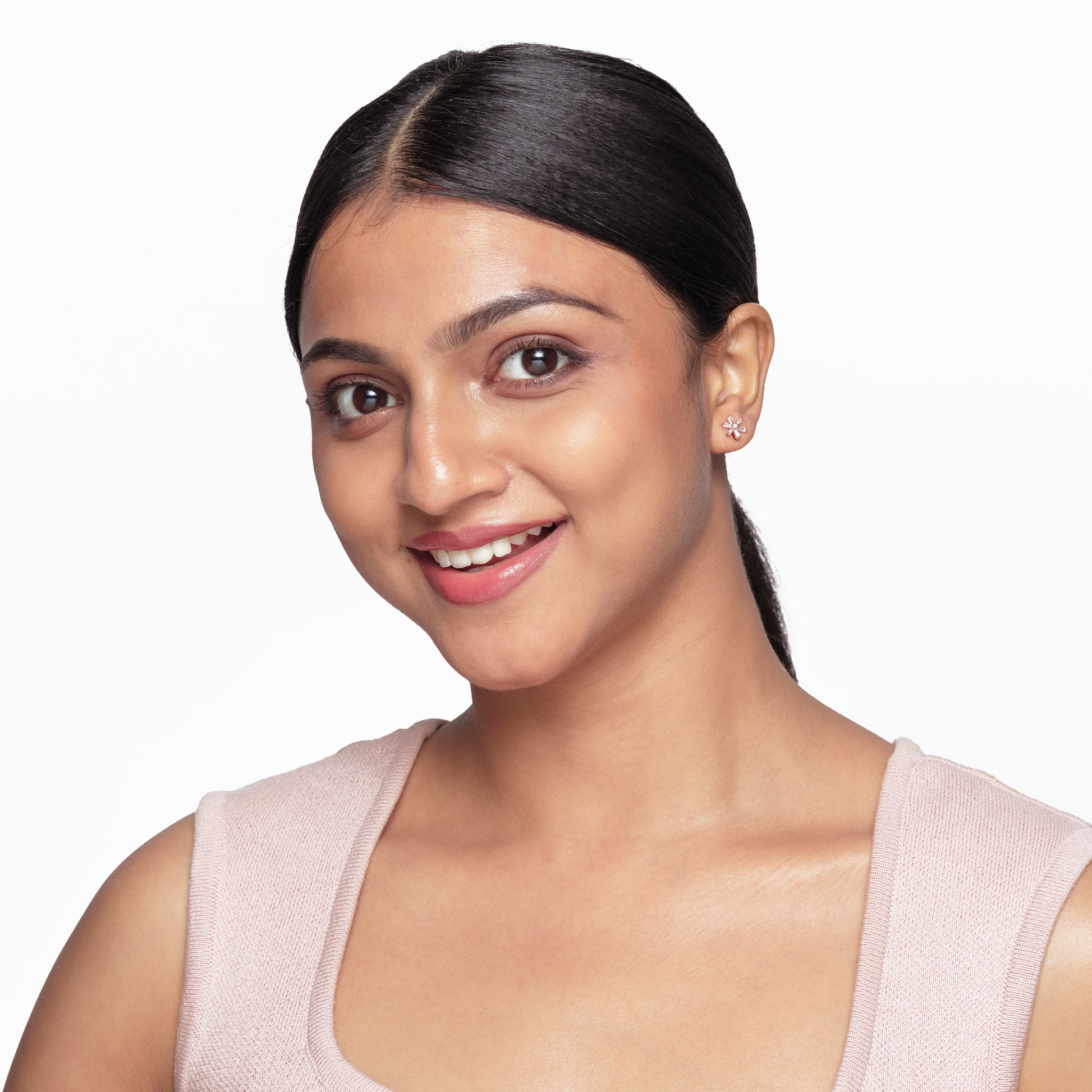 Delicate floral-inspired studs featuring tapered baguette clear CZs on sterling silver for a refined, petal-like sparkle. Ideal for everyday elegance at work or off-duty, available in both silver and rose gold finishes.