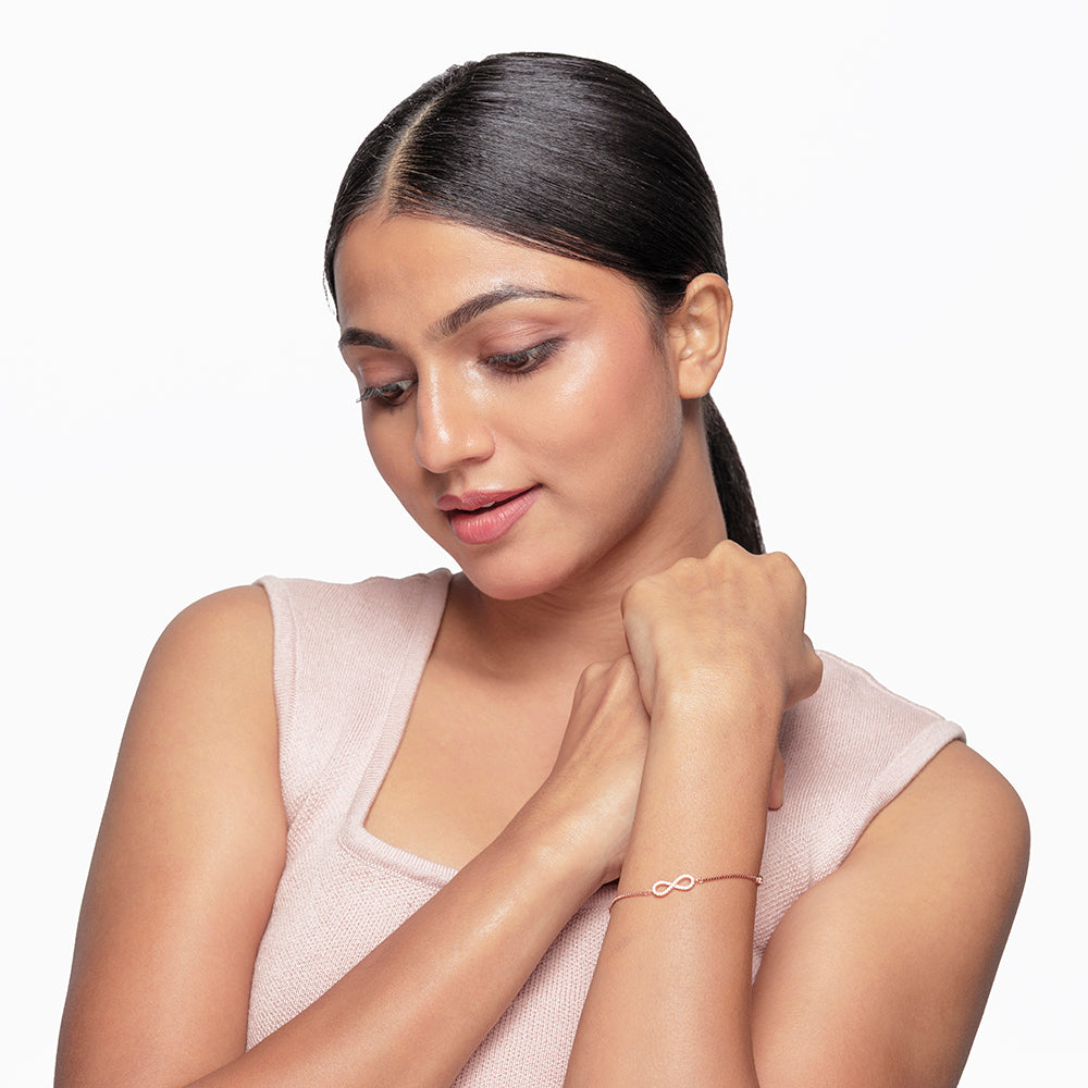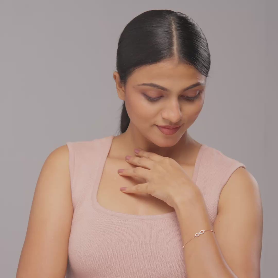 Infinity Bracelet is an elegant accessory crafted from 925 Sterling Silver with a warm rose gold plating. Featuring a beautifully polished mirror finish, it showcases round clear cubic zirconia stones that add subtle sparkle and sophistication. The infinity motif symbolizes eternal love and friendship, making this bracelet both meaningful and stylish. Suitable for casual and work wear, it effortlessly complements a variety of outfits while providing lasting comfort. This bracelet is a timeless piece, perfect for gifting or personal wear as a daily reminder of infinite bonds.