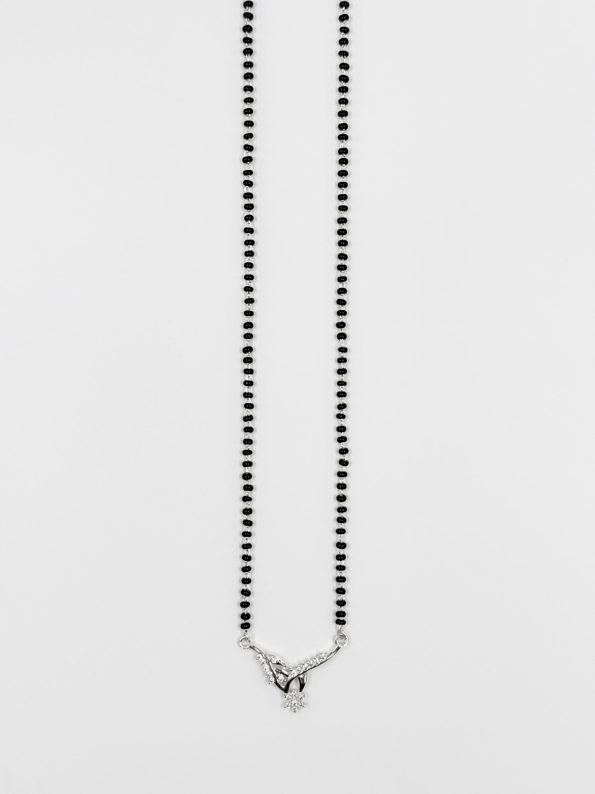 Simple yet significant, this Mangalsutra is crafted in sterling silver with a luminous mirror finish, featuring intricately designed floral motifs embellished with sparkling clear CZs and classic black beads. The central floral drop adds a touch of delicate charm, reflecting timeless femininity and elegance. Perfect for everyday wear and special occasions. Available in silver finish.