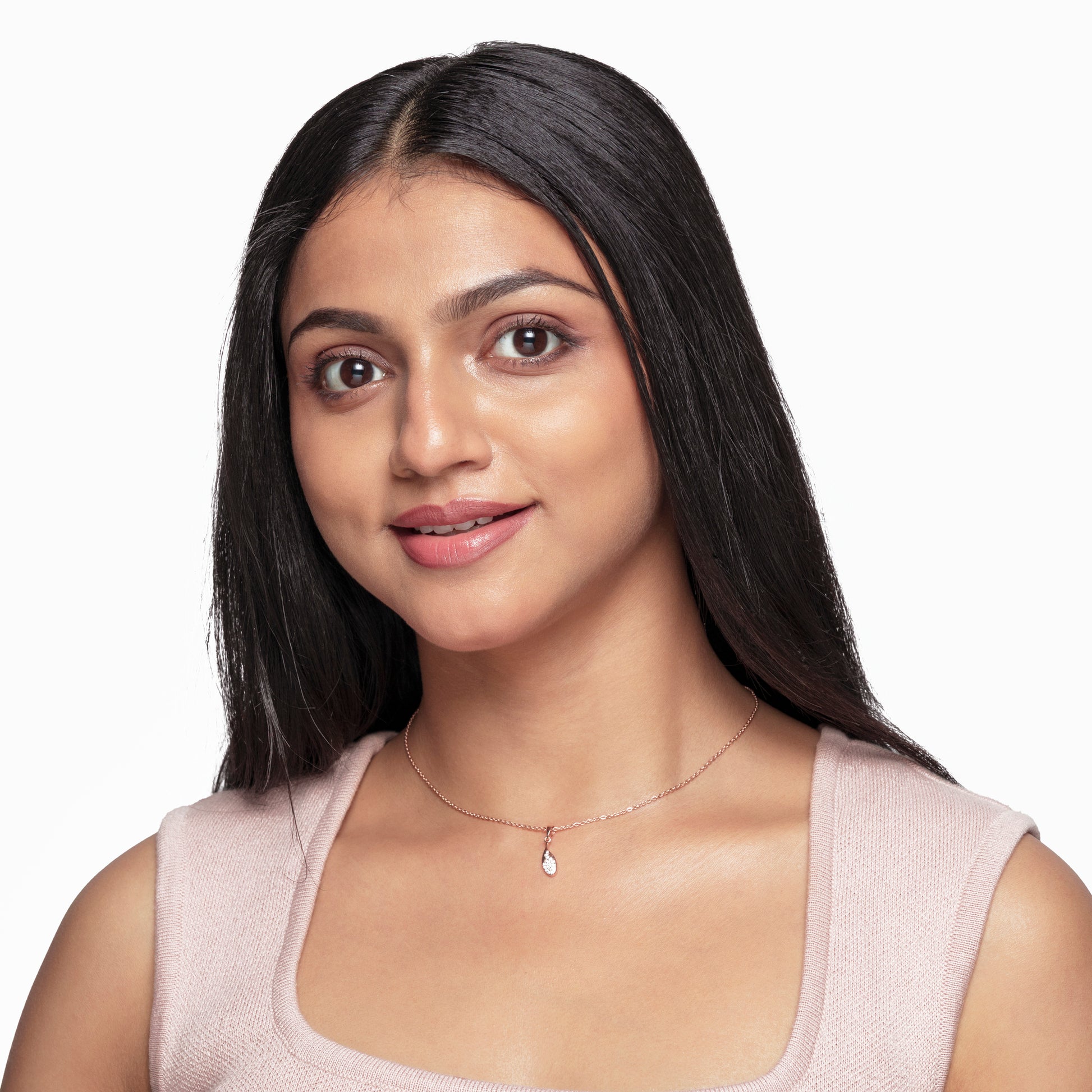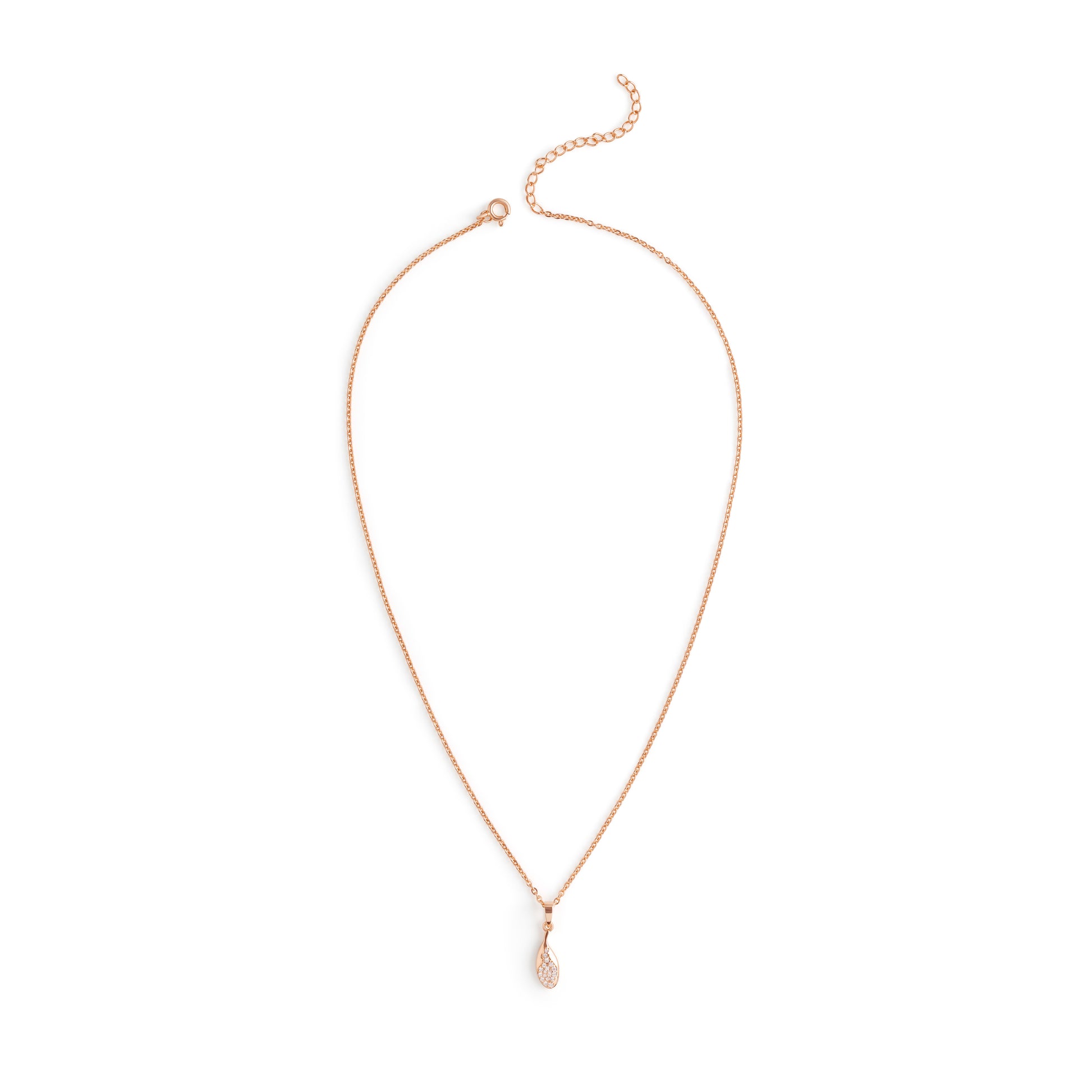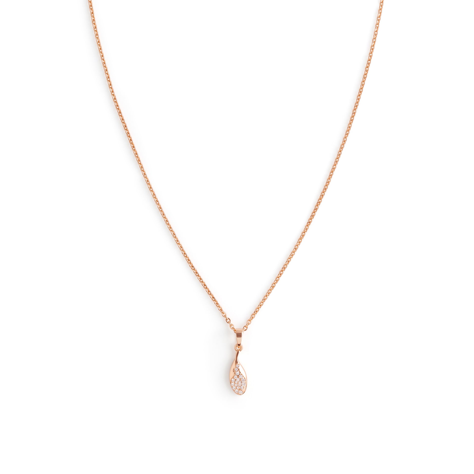 Fine leaf-shaped pendant in sterling silver, accented with a round clear CZ for a fresh, natural sparkle. Its minimal mirror finish makes it ideal for everyday layering. Available in both silver and rose gold finishes.