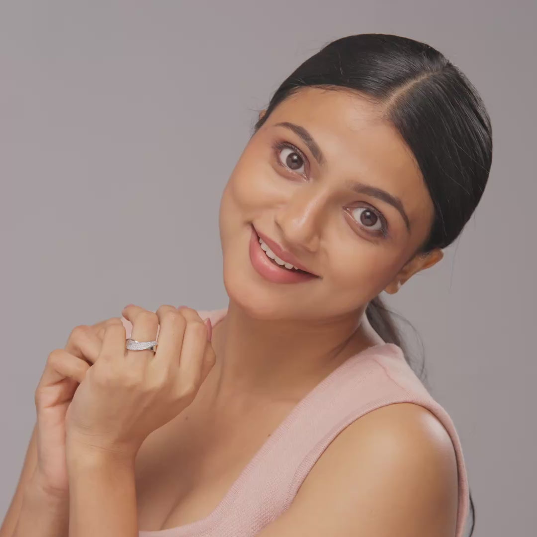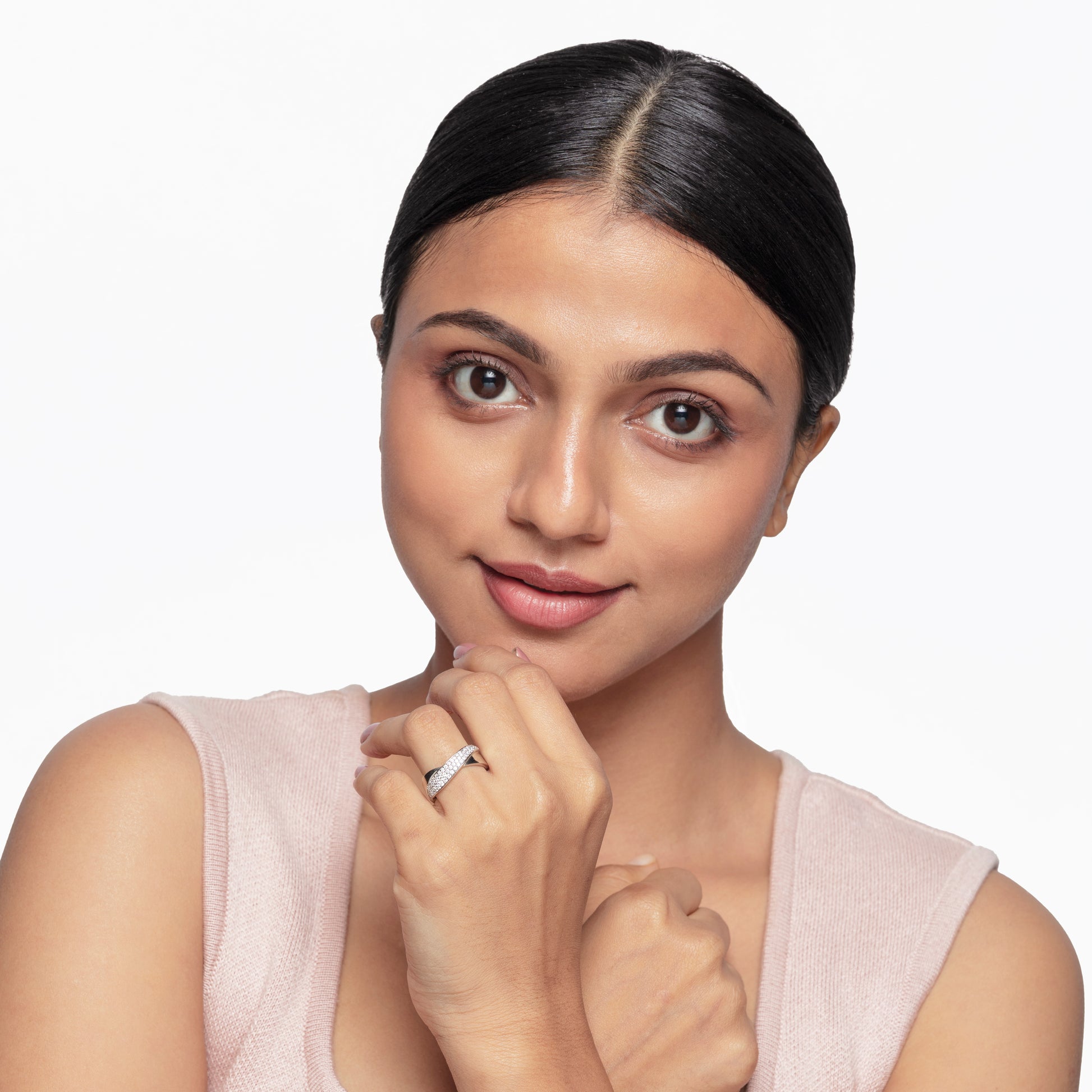 Stylish sterling silver overlapping band ring set with round clear CZs for added brilliance. Perfect for casual or occasion styling, available in both silver and rose gold finishes.
