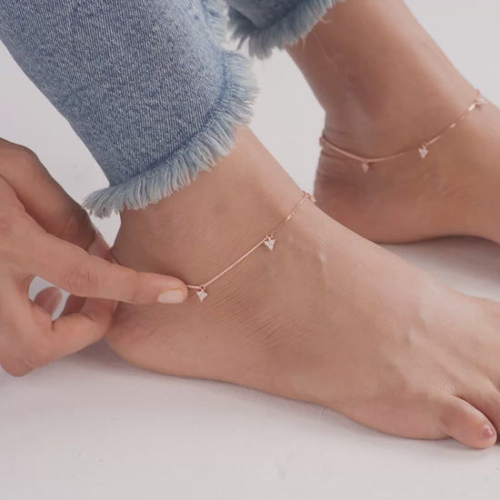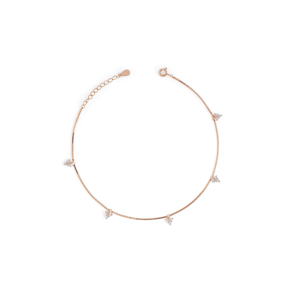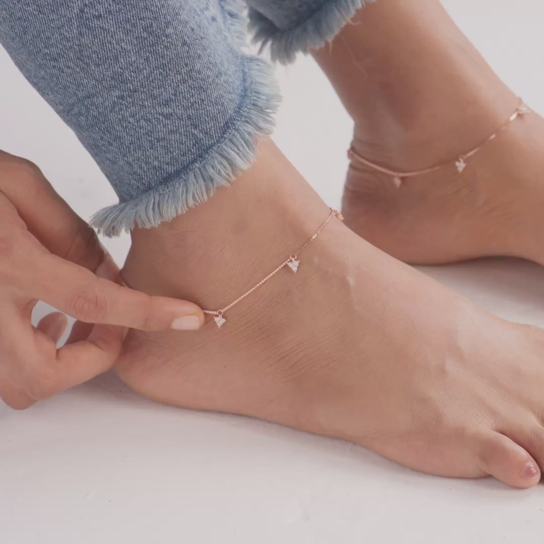 The Triangle Drop Anklet is a stylish accessory crafted from 92.5 Sterling Silver with a radiant rose gold plating. It features elegant triangle-shaped drops adorned with sparkling round clear cubic zirconia stones that catch the light beautifully. The anklet boasts a polished mirror finish, giving it a sophisticated shine perfect for both casual and occasion wear. Lightweight and comfortable, this piece adds a trendy geometric flair to any outfit while maintaining timeless elegance.