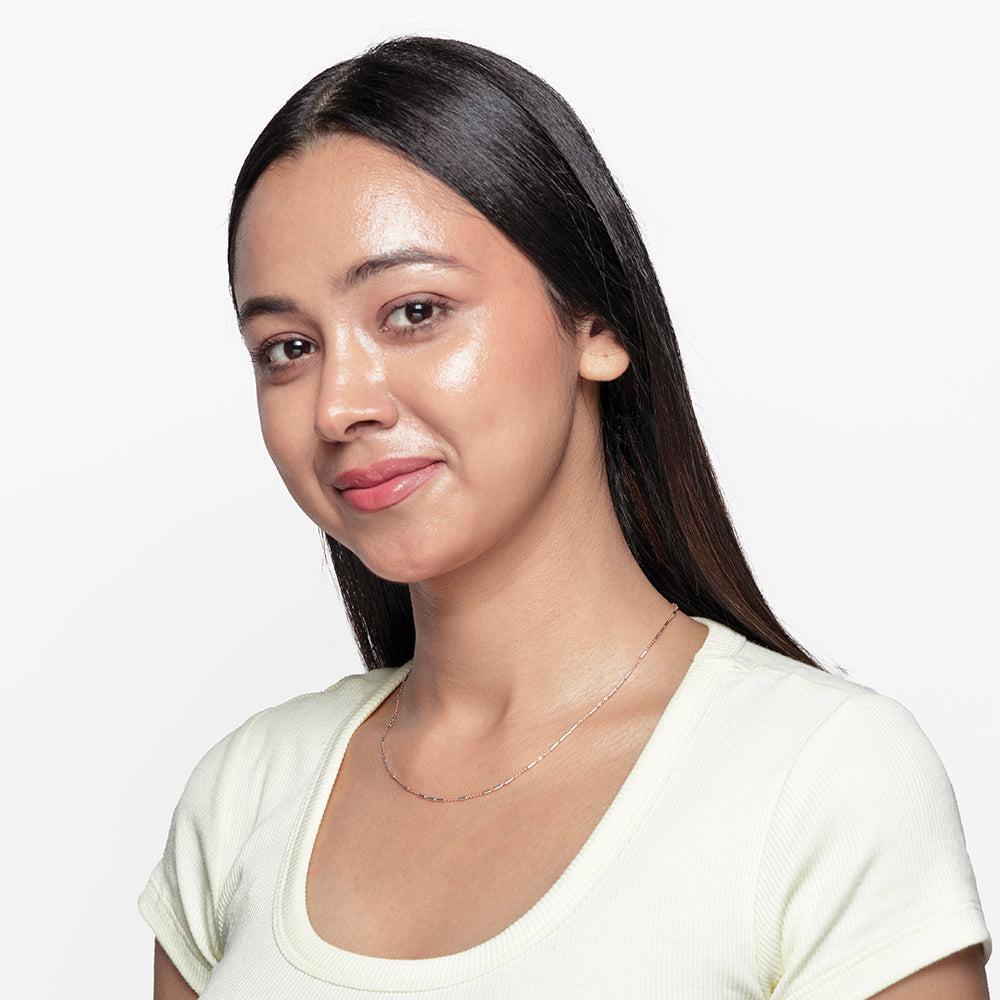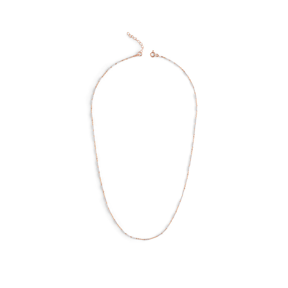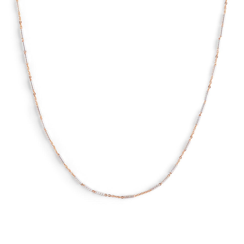 Twisted Tube Dual Tone Chain features elegantly crafted twisted tube motifs in a sophisticated blend of rose gold plating and classic silver finish on sterling silver. Its mirror-polished surface enhances the striking dual-tone design, giving the chain a luminous and dynamic look. Perfect for casual or work wear, this necklace adds a refined yet contemporary touch to any ensemble. Lightweight and versatile, it offers both style and comfort, making it an essential accessory for everyday elegance.